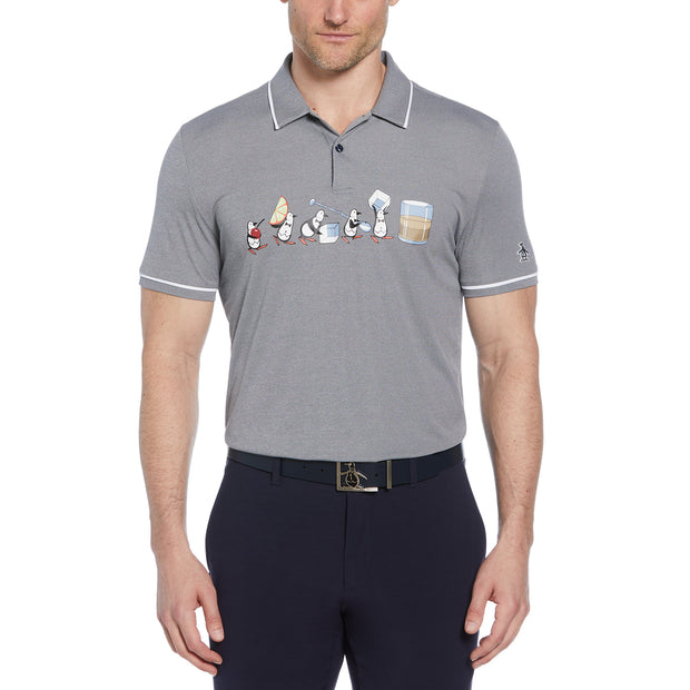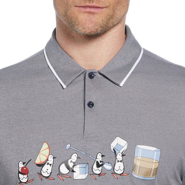 Our mascot Pete is showing off his bartending skills on the front of this playful Original Penguin men’s polo shirt. Great for guys who want to add some fun to their everyday attire, this cheerful design is sure to brighten up your lunch dates, family gatherings and nights out. The polo collar shirt is crafted from durable Oxford fabric, which has a sophisticated braided texture. It has moisture-wicking technology to help keep you dry, while added stretch helps to ensure a flexible fit. Contrast-coloured piping on the sleeves and collar adds definition to the design, and a Pete logo on the left sleeve adds a fun finishing touch to the look. Made from 44% recycled polyester, this polo top is also an eco-friendly option.