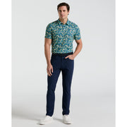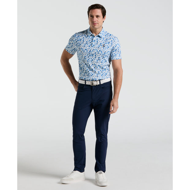 Head to the course in style wearing this Original Penguin men's golf polo. The single knit fabrication creates a lightweight feel, while added stretch provides a comfortable fit that moves with you. For warmer days, moisture-wicking will keep you feeling dry, even as your game heats up. A fun print and sleek self collar make this golf shirt a great addition to your golf wardrobe.