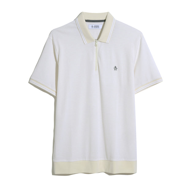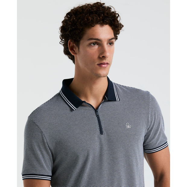 Shake up the classic polo formula with this modern design from Original Penguin. This top updates the timeless polo shirt with a quarter zipper closure, a lively jacquard pattern and eye-catching contrast-colored tipping on the collar and cuffs. A sticker-inspired logo featuring our dapper mascot Pete the penguin on the chest adds a fun finishing touch to the design, making it a great option for everyday errands, lunch dates and family get-togethers.
