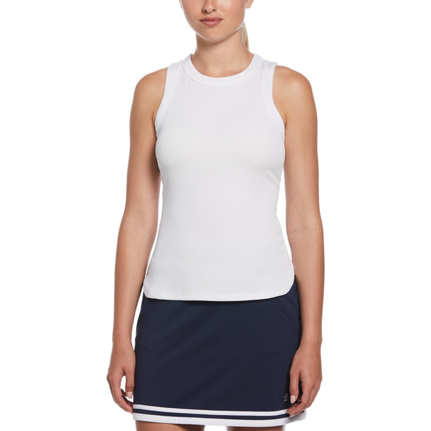 This Original Penguin women's tennis tank top is made from lightweight single knit fabric that offers stretch for ease of movement on the court. Moisture-wicking technology helps to keep you dry, while the tennis top's sleeveless, lightly ribbed design offers a sleek, fashionable look. The versatile solid-colored tank top is ideal for tennis enthusiasts seeking a combination of style and functionality in their sportswear. A Pete logo at the back adds a fun finishing touch to the design.