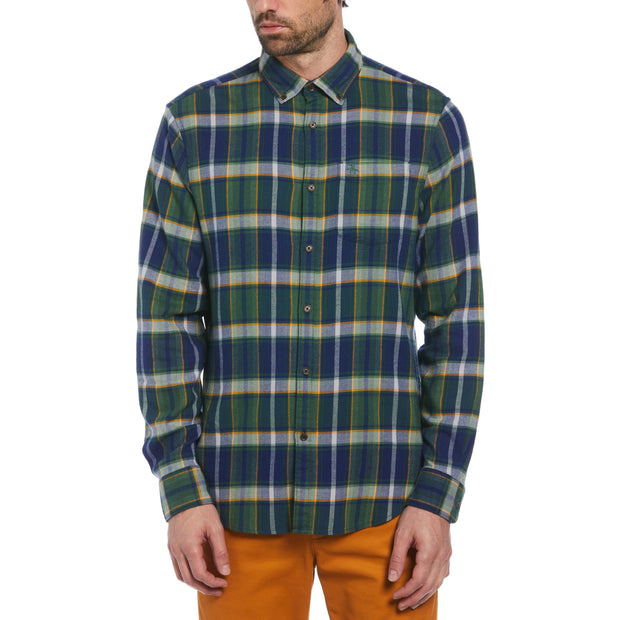 A smart wardrobe staple for the cooler months, this men’s long sleeve button-up shirt from Original Penguin features a classic plaid pattern that fits into any casual setting with ease. The flannel shirt is made with lightweight twill fabric that's enhanced with stretch. The long sleeve shirt is crowned with a button-down collar, which helps to keep it looking sharp and presentable all day long. An eco-friendly option, the shirt is made with 34% EcoVero™ viscose fibers derived from sustainable wood and pulp.