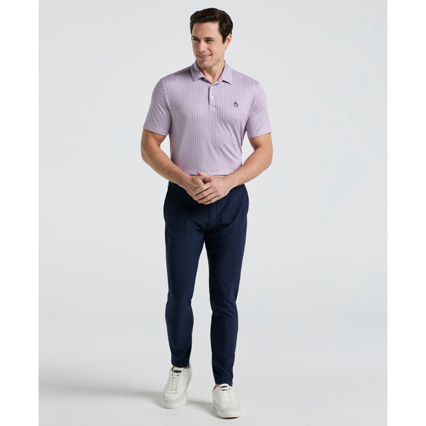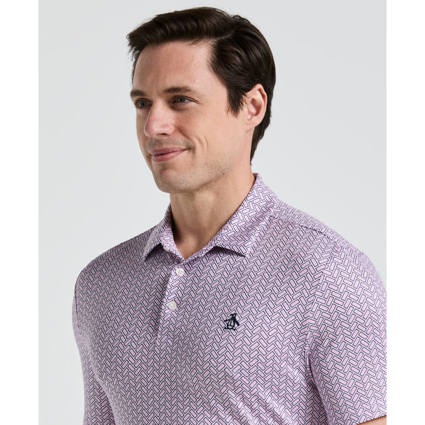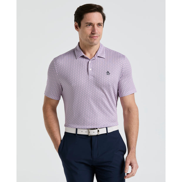 Bring timeless style to the course wearing this Original Penguin men's polo featuring a sophisticated herringbone print. Jersey fabrication creates a soft feel, while added stretch delivers a comfortable fit with optimal flex. When the heat rises, moisture-wicking properties keep you feeling dry. A matching self-collar and 3-button placket finish off this men's polo with classic detailing.