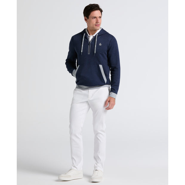 Prepare for cool days ahead with this comfortable layering hoodie from Original Penguin. A hoodie you can count on to last through season after season, it’s crafted from double knit fabric that offers impressive durability. Colour blocked for a modern look, the men’s hooded sweater has a kangaroo pocket at the front for convenient on-the-go storage. The fabric is enhanced with stretch for a comfortable fit, and the hood can be adjusted with a drawstring to help keep it in place when the wind picks up. The design is finished with a fun sticker-inspired Pete logo on the chest.