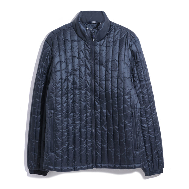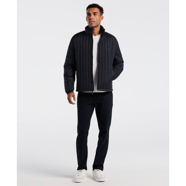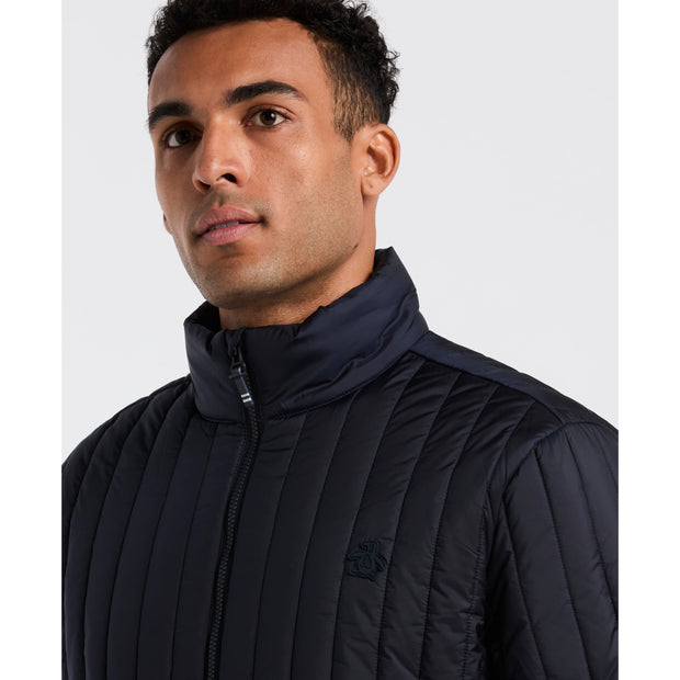 Stay warm and dry in this Original Penguin men's jacket. Made from 100% recycled polyester it has poly fill insulation to keep you warm and a quilted design. The durable plain weave jacket includes a full zip, mock neck collar, and zippered side pockets. Its water-resistant fabric ensures protection against the elements, making it a practical addition to your outerwear collection.