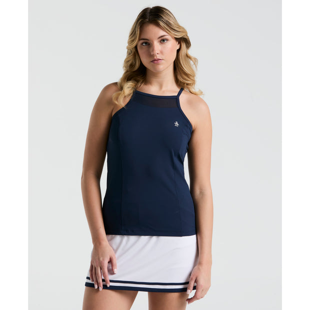 Style meets function with this versatile Original Penguin tennis tank top crafted for performance on the court and off. The single knit fabric is perfectly lightweight, while added stretch gives you the freedom to move your way. Strategic mesh panels and moisture wicking deliver breathable comfort that will keep you feeling dry even as your game heats up. With a flattering sleeveless cut this athletic tank top will be your new workout or game day go-to.